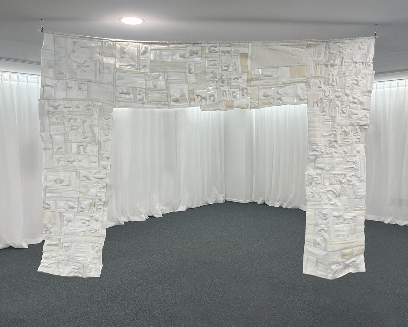원단가게와 협업하는 전시는 천과 섬유가 지닌 재료적 물성을 탐구하는 실험들로 이루어집니다. 천과 섬유가 가지는 유동적인 성질은 형태를 만드는 방식을 달리하며, 포근하면서도 섬세한 감각을 일깨웁니다.